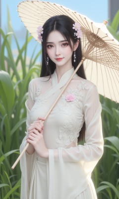 jqzx, . this is a highly detailed digital illustration depicting a young asian woman standing in a serene garden setting. the woman has fair skin, delicate features, and long, straight black hair adorned with intricate floral hairpins. she wears a traditional east asian dress in a soft, creamy white fabric with intricate lace and floral embroidery. the dress features a high collar, long sleeves, and a flowing skirt, exuding elegance and grace. she holds a large, white parasol with delicate, interlaced ribs, providing shade and a focal point in the image.her expression is calm and serene, with a slight smile on her lips. she gazes directly at the viewer, her large, expressive eyes accentuated with subtle makeup, including a touch of pink lipstick. the background is a lush, green garden with tall, leafy plants and a hint of blue sky, suggesting a tranquil, outdoor setting. the illustration is rendered in a hyper-realistic digital art style, with meticulous attention to detail in textures, lighting, and shading, creating a lifelike appearance. the overall mood is serene and ethereal, emphasizing the beauty and tranquility of the subject and her surroundings...,<lora:F1-性感仙侠美女:1>,