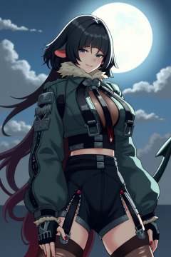 anime, 8k, best quality, masterpiece, (ultra-detailed), good hands, 5 fingers, <lora:简杜-Jane_Doe_r1-000001:1>, jiandoe, tail, pointy ears, default clothes, green jacket, 1girl, black hair, torn clothes, gloves, fingerless gloves, shorts, torn pantyhose, suspenders, necktie, sling, sexy girl is smiling at you, she put her hands on her hips, based on the spire, the full moon is her background, wonderful movie screen,