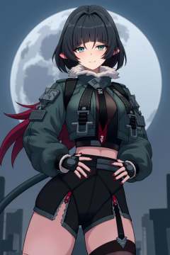 anime, 8k, best quality, masterpiece, (ultra-detailed), good hands, 5 fingers, <lora:简杜-Jane_Doe_r1-000001:1>, jiandoe, tail, pointy ears, default clothes, green jacket, 1girl, black hair, torn clothes, gloves, fingerless gloves, shorts, torn pantyhose, suspenders, necktie, sling, sexy girl is smiling at you, she put her hands on her hips, based on the spire, the full moon is her background, wonderful movie screen,