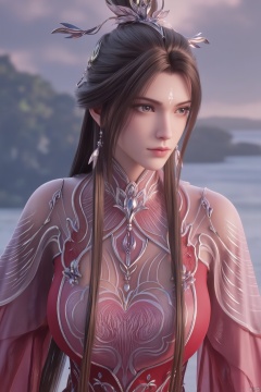 (masterpiece, top quality, best quality, official art, beautiful and aesthetic:1.2),gf-hd, 1girl, solo, hair ornament, jewelry,hanfu dress, red dress, earrings, chinese clothes, brown hair, ribbon, hanfu, red ribbon, shawl, song_hanfu,(big breasts:1.39), monkren,Xluxueqi,XAerith,Xyuanyao