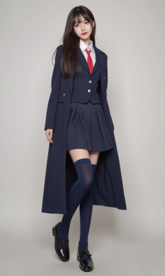 A stunning 25-year-old young woman, radiating youth and vitality, is dressed in a classic Japanese JK (high school girl) uniform. Her long, flowing hair cascades down her shoulders, complementing her graceful appearance. The uniform consists of a neatly pressed blazer in a deep navy blue, adorned with a crisp, white collar and a red ribbon tie. She wears a pleated skirt that falls just above her knees, also in navy blue, which matches her polished Mary Jane shoes. Her legs are adorned with thigh-high socks, adding a touch of playful charm. The girl's bright, expressive eyes and warm smile exude confidence and charisma, making her an enchanting sight to behold.