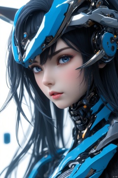 masterpiece, best quality, ultra-detailed, detailed pupils, a close-up shot of a female anime character with long black hair, blue eyes, and pink lips. Her eyes are a piercing blue, and her lips are a lighter shade of pink. Her eyebrows are a darker shade of blue, adding a pop of color to her face. She is wearing a blue and white mask, with a black strap around her neck, and a black helmet on her head. The background is a stark white, and there are a few blurred objects in the background, real photos, cinematic, high quality, studio lighting,HD, 32k, best quality, 8k, super clean,xihua