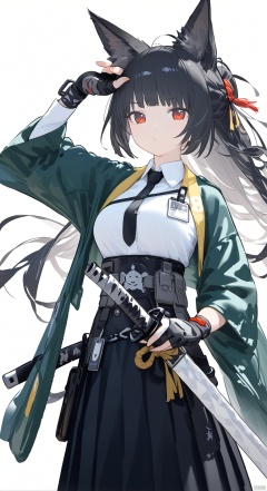 (score_9,score_8_up,score_7_up), (masterpiece),( beautiful),(high quality),(finely detailed),extremely detailed CG unity 8k wallpaper,best quality, 1girl, solo, long hair, breasts, looking at viewer, bangs, skirt, simple background, shirt, black hair, red eyes, gloves, long sleeves, white background, holding, animal ears, medium breasts, closed mouth, jacket, white shirt, weapon, cowboy shot, open clothes, necktie, black gloves, collared shirt, sword, wide sleeves, blunt bangs, fingerless gloves, black skirt, holding weapon, animal ear fluff, fox ears, floating hair, holding sword, katana, sheath, black necktie, unsheathing, holding sheath,miyabi