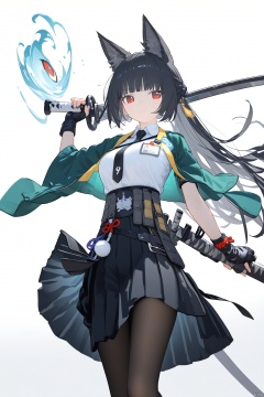 (score_9,score_8_up,score_7_up), (masterpiece),( beautiful),(high quality),(finely detailed),extremely detailed CG unity 8k wallpaper,best quality, 1girl, solo, long hair, breasts, looking at viewer, bangs, skirt, simple background, shirt, black hair, red eyes, gloves, long sleeves, white background, holding, animal ears, very long hair, closed mouth, full body, white shirt, weapon, pantyhose, pleated skirt, boots, necktie, black gloves, collared shirt, sword, blunt bangs, fingerless gloves, black skirt, black footwear, holding weapon, animal ear fluff, black pantyhose, fox ears, holding sword, katana, sheath, black necktie, sheathed, one knee,miyabi