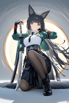 (score_9,score_8_up,score_7_up), (masterpiece),( beautiful),(high quality),(finely detailed),extremely detailed CG unity 8k wallpaper,best quality, 1girl, solo, long hair, breasts, looking at viewer, bangs, skirt, simple background, shirt, black hair, red eyes, gloves, long sleeves, white background, holding, animal ears, very long hair, closed mouth, full body, white shirt, weapon, pantyhose, pleated skirt, boots, necktie, black gloves, collared shirt, sword, blunt bangs, fingerless gloves, black skirt, black footwear, holding weapon, animal ear fluff, black pantyhose, fox ears, holding sword, katana, sheath, black necktie, sheathed, one knee,miyabi