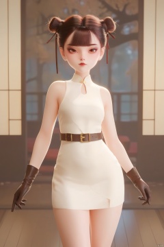 score_9, score_8_up, score_7_up,highly detailed digital,1girl, solo, looking at viewer, short hair, bangs, brown hair, gloves, dress, brown eyes, closed mouth, standing, cowboy shot, sleeveless, belt, indoors, blunt bangs, hair bun, white dress, lips,double bun, sleeveless dress, short dress