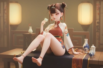 score_9, score_8_up, score_7_up,highly detailed digital,1girl, solo, breasts, short hair, bangs, brown hair, hair ornament, dress, holding, brown eyes, jewelry, sitting, full body, earrings, food, barefoot, indoors, wide sleeves, blunt bangs, hair bun, feet, cup, lips, legs, eyelashes, bare legs, double bun, toes, arm support, chinese clothes, soles, table, single hair bun, bottle, china dress, lantern, anklet, vase