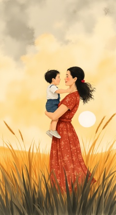 sunset,mother holding child,wind,grass,watercolor style,