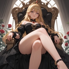 score_9, score_8_up, score_7_up, 1 girl, blonde hair, long hair, seducing viewer, hearts,posing, suggestive pose, sitting on throne, solo, hearts, black royal dress, off shoulder, roses, legs up, from below, air of superiority, crossed legs, golden tiara, flowers, plants