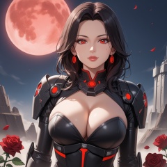 (,1girl, ,best quality, ),,  ,,ultra realistic 8k cg,, ,masterpiece, (( , )),, ,science fiction,mole, ,    ,red moon, black rose,     (cleavage),,  (),