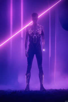 solo, 1boy, standing, male focus, sky, from behind, glowing, science fiction, laser,Vaporwave style