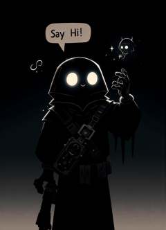 sfw,digital illustration, 2d, dark, hallow eyes,floating text "Say Hi!",  male jawa, nanorobotics researcher,infiltrator, tribal sling with text in speech bubble "Hi!"