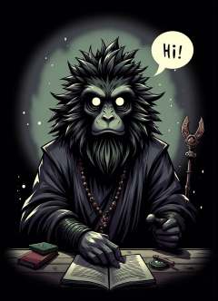 sfw,digital illustration, 2d, dark, hallow eyes,text "Say Hi!", thoth, god of writing, knowledge, magic, depicted as a man with the head of an baboon, keeper of divine knowledge, associated with the moon and reckoning of time, revered as a wise counselor and magician, guardian of sacred texts with text in speech bubble "Hi!"