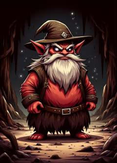 sfw,digital illustration, 2d, dark, hallow eyes, diablo, small humanoid creature, stocky and stout appearance, long white beard, pointed hat, red or earth toned, rounded belly, rosy cheeks, practical earthy clothing, connection to earth and nature, underground settings, craftsmanship, earth magic, friendly, industrious
