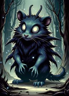 sfw,digital illustration, 2d, dark, hallow eyes,  enormous enchanted webbed industrial rodent life form,  furry appendages,  bushy-tailed, fuzzy fur,  rounded ears,    # helical horns,  #