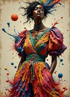 donmp41n717bl4ckfx sfw,digital artwork,  oversized upper body clothing,  twill,  canvas, puff sleeves, asymmetrical hemline, natural waist,  embellishments,  belt loops,  vintage design, colorful, surreal
