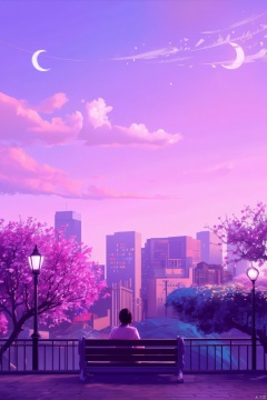 1girl, solo, sitting, outdoors, sky, cloud, tree, moon, cloudy sky, cherry blossoms, building, scenery, city, railing, cityscape, crescent moon, lamppost, skyscraper, pink sky,Vaporwave style,