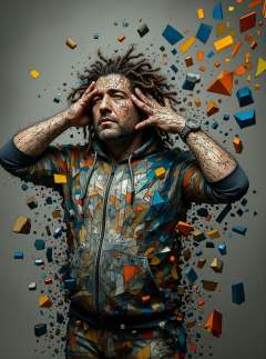 DonMFr4ctur3dD1ffFXthe, geometric shapes, sfw, male midlife full-figured, southeast asian, light blue eyes, pointed ears, dorsal hump nose, receding jaw, curved forehead, long face shape, , caramel dreadlocks hair, boredom wearing tartan jersey trousers, hoodie, , hands on head, displaying frustration, bulky full body clothing, gravitational smart thread, holographic interference texture, mesh, three-quarter sleeves, high-low hemline, empire waist, mermaid skirt, typography