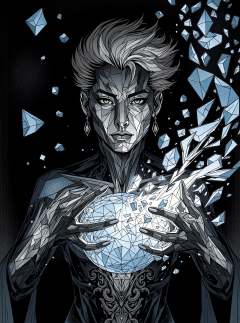 DonMFr4ctur3dD1ffFXthe, geometric shapes, sfw,  female male  retirement age fit, east asian, green eyes, torn ears, unique nose, receding chin,       , silver blonde short and messy hairstyle hair, grief,  conjuring water with cupped hands, controlling its flow and power,    occultist, entropy magic , sorting magical ingredients with precision, preparing spell components, ethereal light