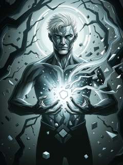 DonMFr4ctur3dD1ffFXthe, geometric shapes, sfw,  male jiaoren, Mermaid-like beings from Chinese mythology,  known for their tears turning into pearls,  benevolent and beautiful, associated with the sea and its mysteries,  symbolize love, beauty, allure of the unknown, midlife muscular, east asian, turquoise eyes, large ears,  square chin with cleft, receding jaw,  low forehead,    distinguished goatee , platinum blonde short and messy hairstyle hair, affection,  spatial expansion, arms spread wide, expanding magical reach,       warlock, entropy magic , concentrated stance, eyes closed, mentally focusing on the spell, halo, radiant aura, a haunted forest, where twisted trees and fog create an ominous atmosphere