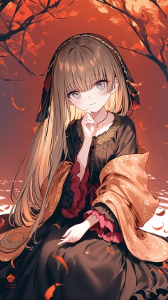 (masterpiece),(best quality),illustration,ultra detailed,hdr,Depth of field,(colorful),loli,[Artist:wlop],[[Artist:sheya]],Artist:hiten_(hitenkei),mmd,hanfu,1girl,loli,solo,long hair,dress,branch,holding,looking at viewer,feathers,brown hair,long sleeves,black dress,head tilt,parted lips,closed mouth,flower,grey eyes,sitting,shawl,smile,cover,
