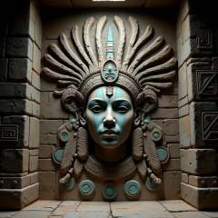 <lora:Laura_Flux_Ahkinama:1>In the heart of an ancient city, a colossal stone mural adorns the inner sanctum of a forgotten temple. At its center is the intricately carved face of a Mayan priestess or deity, her serene expression radiating wisdom and mystery. Her headpiece is an elaborate construction of feathers, geometric patterns, and sacred symbols, representing her connection to both the heavens and the earth. The surrounding stone wall is adorned with interlocking glyphs and futuristic geometric shapes, creating a seamless blend of ancient architecture and otherworldly technology.The priestess’s face appears lifelike, with turquoise accents on her cheeks and eyes that seem to follow those who enter the chamber. The air hums with an ancient energy, and the walls of the temple seem to pulse with the knowledge of a forgotten civilization. Legends say that this mural is not merely a tribute, but a portal to a realm of higher understanding, activated only by those who can decipher the sacred glyphs embedded within the wall. The temple’s hidden power lies dormant, waiting for the next chosen one to unlock its secrets.