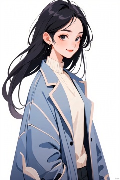 1girl,solo,long hair,black eyes, red hair,smile,elegant,delicate facial features, upper body ,blue and white porcelain overcoat,white sweater,black hair ,looking at viewer,simple background, white background,(best quality), ((masterpiece)), (an extremely delicate and beautiful), original, extremely detailed wallpaper