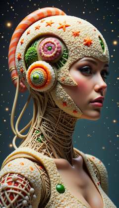 <lora:SushiStyleFlux:1>Made out of sushi, a SushiStyle Portrait of Megan Fox wearing epic bionic cyborg implants of different vibrant colors, detailed intricate ornate cables connected to head, portrait front face reference, by Dan Mumford and Naoto Hattori, extremely beautiful and proportionate, masterpiece, intricate, highly detailed, digital painting, Blade Runner, artstation, concept art, crepuscular rays, smooth, sharp focus, illustration, background made from fractals of vibrant universe stars, cyberpunk colors, volumetric lighting, art by artgerm and james jean and Nick Sullo, in asteroid field