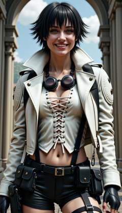 A hyper realistic photorealistic professional photography of a smiling 30 year old l4rg3j4ck3suit woman. She is in a enchanted tower background. from below Painting.She has black messy short and wide hair, and her left eye is (green:0.4) while her right eye is (orange:0.4) as she has heterochromia and heterochromic eyes. She is happy. (She also has a slight faded scar going across her nose.:0.3). She is wearing a loose fitting white leather vest jacket with an open front and buttons. The jacket is leathery and creased and has shoulder pads and a large white collar. Under the jacket she is wearing a hanging laced white undershirt with a large collar. She has a black strap over this covering her upper chest. She has a pair of small welder eye goggles hanging around her neck on the front. On her hands she wears a pair of black fingerless gloves. She is also wearing a set of black micro shorts with black suspenders going up under her jacket. On the black shorts are several sets of equipment pouches, like a tactical belt. She has two gun holsters equipped on her thighs and she has two black straps around each thigh. Her legs are covered in black leather army boots with several straps, and her legs are covered in black thigh-high tactical leather boots.}She is in a spa background.