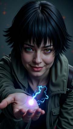 A hyper realistic photorealistic professional photography of a smiling 30 year old c45u4l4de woman. She is in a dark nebula background. from above Clutching a holy symbol, casting a spell with their other hand.She has black messy short and wide hair, and her left eye is (green:0.4) while her right eye is (orange:0.4) as she has heterochromia and heterochromic eyes. She is doing a sleepy expression. (She also has a slight faded scar going across her nose.:0.3). She is wearing casual clothes.She is in a dark matter facility background.