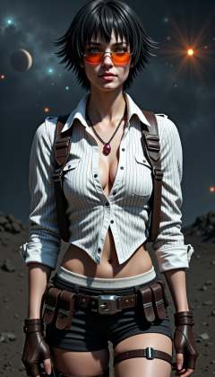 A hyper realistic photorealistic professional photography of a 30 year old p1n5tr1p3d woman. She is in a dark nebula background. She has black messy short and wide hair, and her left eye is (green:0.4) while her right eye is (orange:0.4) as she has heterochromia and heterochromic eyes. She is happy. (She also has a slight faded scar going across her nose.:0.3). She is wearing a white shirt long shirt large collar and open front revealing her clevage. She has a necklace with a red crystal on it. The shirt has thin dark stripes along the vertical. She has a shoulder holster and a leather strap running across her upper chest. She is wearing leather cutout gloves and her midriff and navel is revealed as her shirt separates only at the bottom. The rest of the shirt is buttoned. The shirt has pockets on the front. She is wearing matching micro shorts, revealing her long slender legs. Along one leg she has two leather straps, and she has knee-high white socks covered by long brown shoelaced leather high heel boots going up to her knees. Around her waist is an army belt with lots of pouches and equipment hanging on. She is also wearing orange hue modern sunglasses. She is in a perpetual storm background.