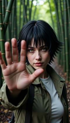 A hyper realistic photorealistic professional photography of a serious 30 year old c45u4l4de woman. She is in a intergalactic market background. (full body shot:0.6) Standing with one hand extended, creating a barrier.She has black messy short and wide hair, and her left eye is (green:0.4) while her right eye is (orange:0.4) as she has heterochromia and heterochromic eyes. She is doing a proud expression. (She also has a slight faded scar going across her nose.:0.3). She is wearing outdoors clothes.She is in a bamboo forest background.