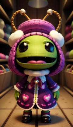 <lora:SackboyCharacterFlux:1> sackgirl Mantis from Kung Fu Panda, open mouth expression, woven, stitches, stitching, in a pose: Haunted: A face with a distressing unsettling quality as if plagued by ghosts., in location shop