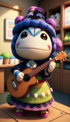 <lora:SackboyCharacterFlux:1> sackgirl Gloria the Hippo from Madagascar, happy expression, woven, stitches, stitching, in a pose: Holding a guitar, strumming the strings with feeling, in location doctors office