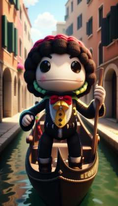 <lora:SackboyCharacterFlux:1> sackbaby Spike Spiegel from Cowboy Bebop, smiling expression, woven, stitches, stitching, in a pose: Reading Minds with Magic, in location venice, gondola ride