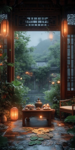 no humans, scenery, architecture, plant, lantern, table, window, east asian architecture, rain, chair, plate, flower, lamp, lily pad, potted plant, lattice, pond, vase, wooden floor, food, teapot, tree, cup