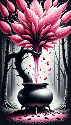 <lora:DarkCharcoalFlux:0.75>A monochrome dark charcoal drawing. A sketchy, rough and messy drawing of Fantasy illustration of a glossy cherry blossom tree in full bloom, with pink petals gently falling in a misty forest. A large, ornate cauldron sits at the base of the tree, with a magical potion brewing inside, casting an ethereal glow. The potion is a mix of swirling blues, greens and purples. The overall atmosphere is enchanting and serene., black and white
