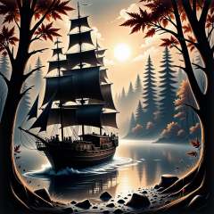 <lora:DarkCharcoalFlux:1> Realistic digital painting of a ghost ship sailing in a misty forest next to a shimmering lake. The forest has tall trees with autumn leaves, creating a golden canopy. The lake reflects the secrets of the forest, and the ghost ship is sailing towards the horizon. The overall mood is melancholic and mysterious.