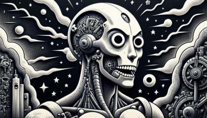 <lora:DarkCharcoalFlux:1>Black background, white chalk, A monochrome dark rough charcoal sketch of in the art style of h. r. giger a portrait of a ruby ultron from age of ultron, clockwork steampunk, head and chest only, by beksinski, 4 k, deviantart, trending on artstation, black and white