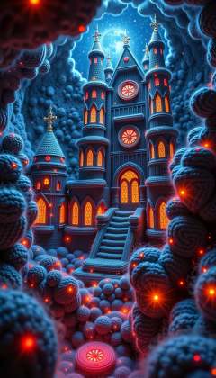 Made out of wool a 3D render of a futuristic cathedral, galactic symphony, celestial orrery, intricate architecture, neon lights, holographic stained glass, metallic and glass materials, floating islands, space background, dramatic contrast, sharp focus, vibrant colors, detailed textures, surreal, sci-fi, surreal, artstation, concept art, illustration, digital painting, wide angle, artbook, wallpaper, promo art, dramatic lighting