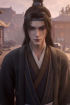 1boy,look at the camera,20-year-old,bust,In the morning,standing in the hazy morning mist,handsome,Chinese Costume,dark blue Hanfu,broad shoulders,manly chinese dudes,handsome male,bloodstain,dark blue headband,wind,floating hair,blacklong hair,High ponytail,swordsman (full body:0.4),realistic,outdoors,A shot with tension,Visual impact,Chinese Zen style,impactful picture,best quality,8k,hyper quality,high detail,ultra detailed,Masterpiece,solo,Big movie style,bust,solo,black hair,looking at viewer,realistic,indoors,upper body,long hair,headband,closed mouth,blurry,topknot,blurry background,robe,hair bun,,,hair band,