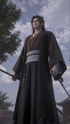solo, long hair, black hair, 1boy, holding, standing, ponytail, weapon, male focus, outdoors, japanese clothes, sky, sword, cloud, wide sleeves, holding weapon, tree, bandages, holding sword, from below, cloudy sky, grey sky