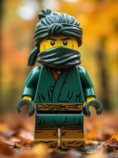 OBlegao,A close-up shot of a lego miniatures set against a blurred backdrop of autumn leaves. The lego is a vibrant green color