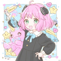 Anime-inspired illustration a young girl with pink hair and bangs wearing a black and white school uniform with a blue bow holding a pink unicorn-shaped toy surrounded by colorful background with various symbols including a pencil with the word "family" and "family" and a rainbow scattered hearts and stars playful and whimsical., 1girl, anya \(spy x family\), pink hair, child, stuffed toy, dress, solo, black dress, open mouth, heart, ahoge, stuffed animal, smile, blush, long sleeves, shirt, white shirt, bow, star \(symbol\), green eyes, hairpods, looking at viewer, hand on own hip, holding, blue bow, collared shirt, ribbon, :d, arm up, upper teeth only, teeth, bowtie