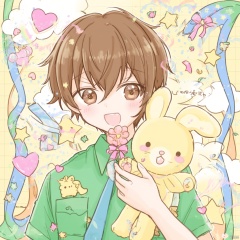Anime-style illustration young girl with brown hair and brown eyes wearing a green shirt with stars on it holding a yellow bunny doll with a pink flower in her hand surrounded by colorful ribbons stars rainbows clouds and hearts smiling expression soft and cheerful mood., rainbow, 1boy, male focus, brown hair, brown eyes, heart, star \(symbol\), necktie, shirt, stuffed toy, solo, flower, holding, looking at viewer, open mouth, stuffed animal, blush, collared shirt