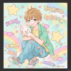Anime-inspired illustration young man with blonde hair and blue eyes wearing a green kimono and blue pajamas holding a white rabbit surrounded by pastel-colored background with rainbow and hearts text above him playful and whimsical mood casual pose playful expression vibrant colors playful elements., rainbow, 1boy, male focus, solo, shirt, blue eyes, heart, open mouth, pants, smile, yellow shirt, short hair, looking at viewer, blush, stuffed toy, shoes, star \(symbol\), brown hair, holding, denim, sneakers, multicolored background, short sleeves