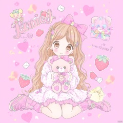 Anime-style illustration a young girl in a pink and white dress with a bow on her head holding a teddy bear surrounded by heart-shaped decorations strawberries and text that reads "Fancy" above her head. She has long blonde hair and a pink bow and she has a smiley face and the background is pink., 1girl, teddy bear, solo, stuffed toy, stuffed animal, strawberry, letter, shoes, fruit, long hair, bow, envelope, brown hair, food, heart, english text, pink bow, hair bow, hair ornament, sitting, blush, long sleeves, hairclip, socks, frills, shirt, sweater, full body