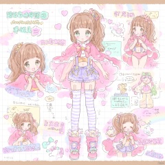 Anime drawing a girl in a pink and purple cape and dress holding a lollipop standing on a checkered background with her hairTraditional Chinese characters in the background one of the characters is holding a pink flower one in a bow on her head one on the left side of the drawing one with a pink bow in her hair one looking at the camera one holding a fluffy pink flower., 1girl, side ponytail, thighhighs, heart, suspenders, green eyes, multiple views, boots, shorts, open mouth, blush, cape, pink footwear, smile, striped clothes, navel, drill hair, looking at viewer, flying sweatdrops, striped thighhighs, midriff, suspender shorts, holding, blunt bangs, standing, closed eyes, wand, reference sheet, character name, vertical-striped clothes, brown hair, full body, long hair, :o