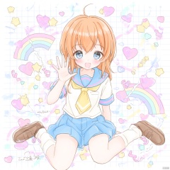 Anime drawing cartoon-like girl in a school uniform sitting on a graph paper background surrounded by heart-shaped hearts and rainbow holding a hand up to her mouth wearing a yellow scarf and blue shorts long brown hair blue eyes smiling expression hand gesture playful and cheerful mood soft pastel colors detailed drawing medium shot slight smile., 1girl, solo, ryuuguu rena, blue eyes, skirt, heart, white socks, smile, rainbow, sailor collar, school uniform, socks, blue skirt, pleated skirt, short sleeves, white shirt, shirt, yellow neckerchief, orange hair, blush, blue sailor collar, shoes, open mouth, serafuku, looking at viewer, full body, sitting, brown footwear, loafers, :d, hand up, white background, neckerchief, star \(symbol\), waving, short hair, hair between eyes
