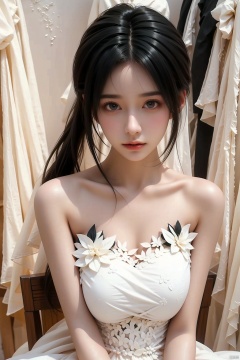 1girl solo breasts looking at viewer short hair black hair dress bare shoulders sitting closed mouth collarbone indoors white dress black eyes lips strapless strapless dress wedding dress realistic